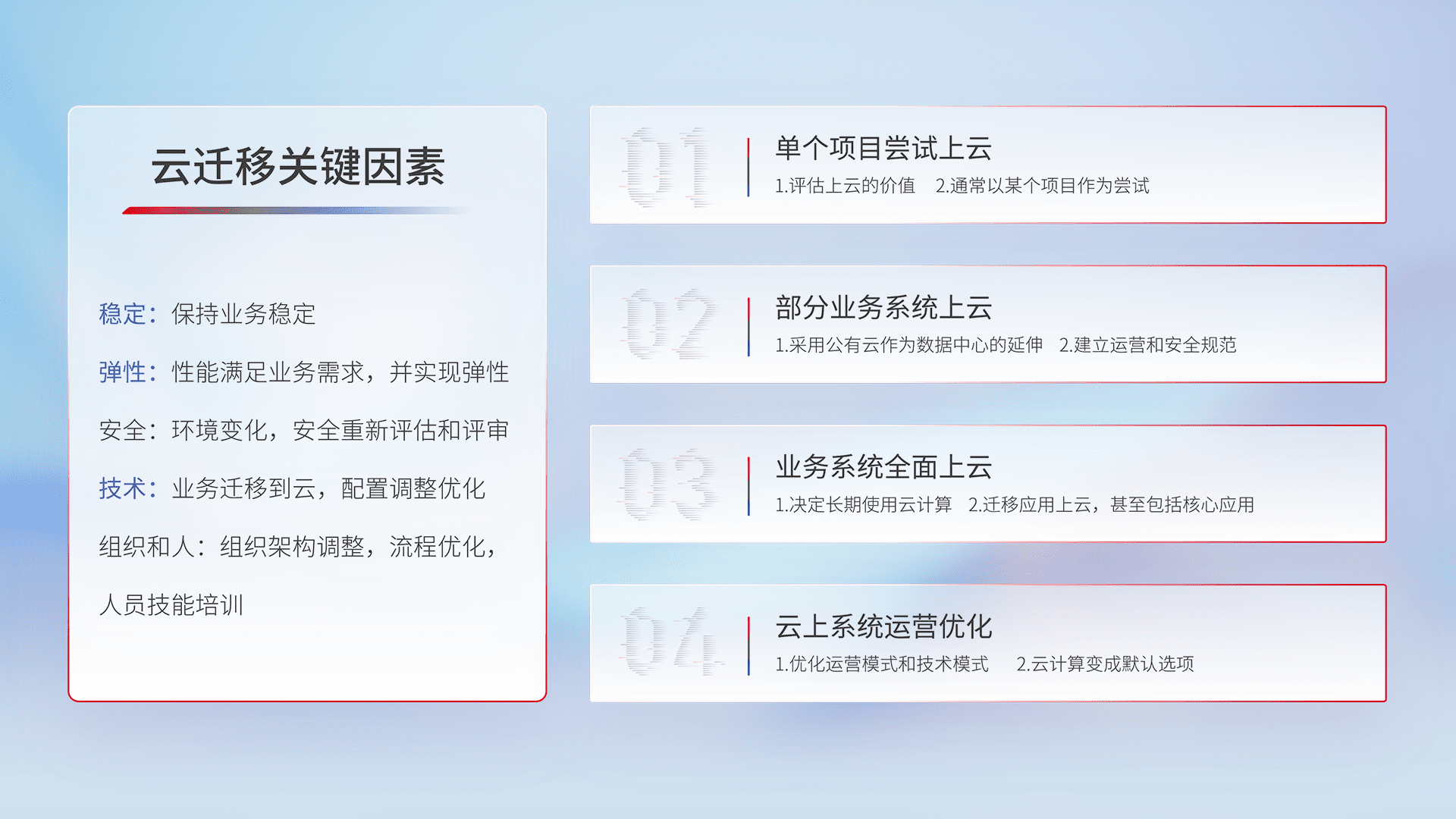 结合实际业务,,,从规划设计、、、、云平台选型、、、云原生改造、、数据迁移、、、、集成交付,,迁移全过程为客户识别最佳上云路径,,,,做好风险识别管理,,,设计网络架构、、、身份权限、、、、安全审计合规、、操作审计、、、日志审计、、监控告警策略、、、、多站点容灾设计等,,,,对云上基础设施进行整体规划,,,提升IT治理水平,,,,以满足弹性、、高可用、、、、高性能的需求。。