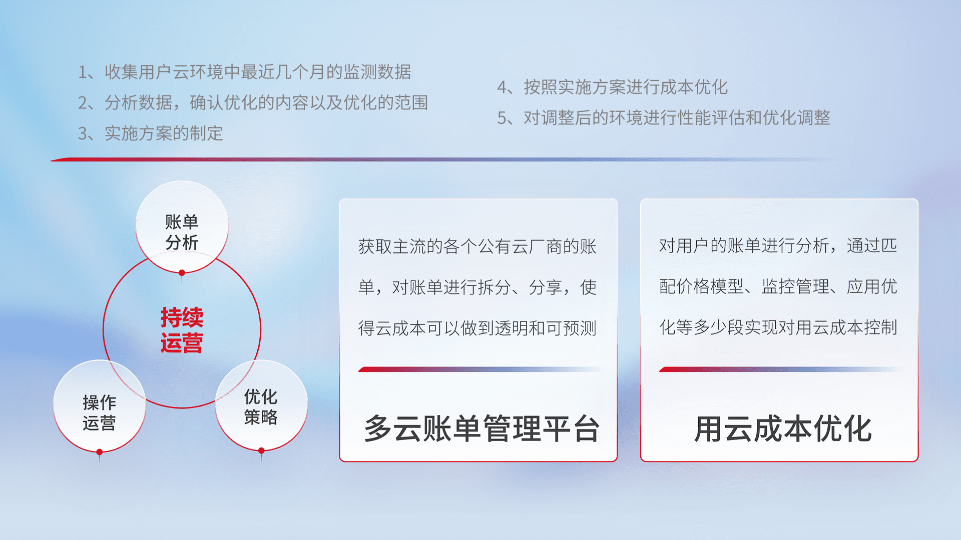 通过多云纳管,,,,以统一的资源数据模型把客户的云资源进行抽象和封装,,进而实现对多云资源的统一操作,,,保障云资源管理的可靠性、、、稳定性与可用性。。。量身定制化运维内容,,,,配置、、、、开发运维、、补丁管理、、备份、、、、监控、、认证和访问管理、、审计和日常巡检等,,,保障在用云过程中的可靠度,,,,稳定度以及高可用率。。
