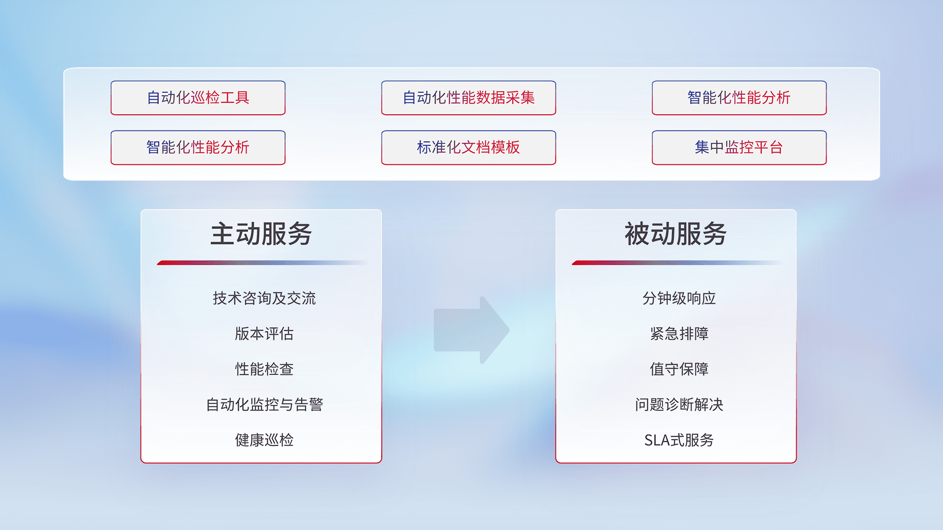 智能化工具和标准化文档,,,保障服务质量,,,提供主动服务(包含技术咨询、、版本评估、、、性能检查、、、自动化监控与告警、、、健康巡检)和被动服务包含(分钟级响应、、、紧急排障、、值守保障、、、问题诊断解决、、、SLA服务)。。。。